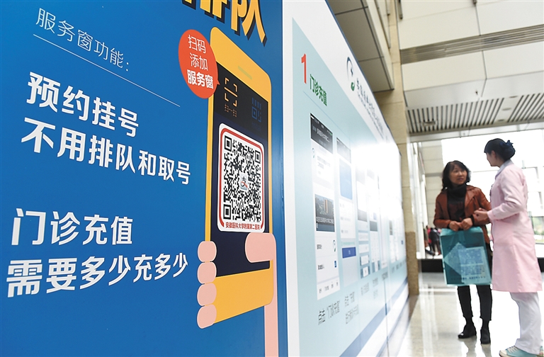 3月18日,医院工作人员向患者介绍“安徽医科大学第二附属医院”支付宝钱包服务窗平台。 当日,安徽医科大学第二附属医院正式入驻支付宝钱包服务窗平台,成为安徽省首家支付宝“未来医院”。今后,城乡居民在该医院就诊,在手机上就能完成预约挂号、充值缴费、报告查询等流程,享受更加便捷的就医服务。新华社记者 刘军喜 摄