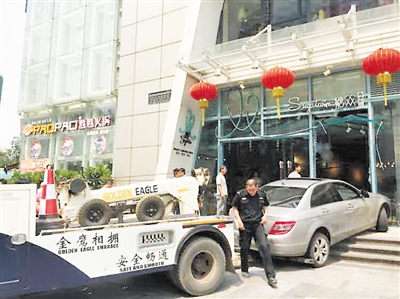 昨天上午10时50分左右,龙昆南路大润发广场前,一辆奔驰小轿车突然冲进一楼铺面一家甜品店,撞碎近2米高的钢化立地玻璃窗。所幸当时店内人员少,没有造成人员伤亡。