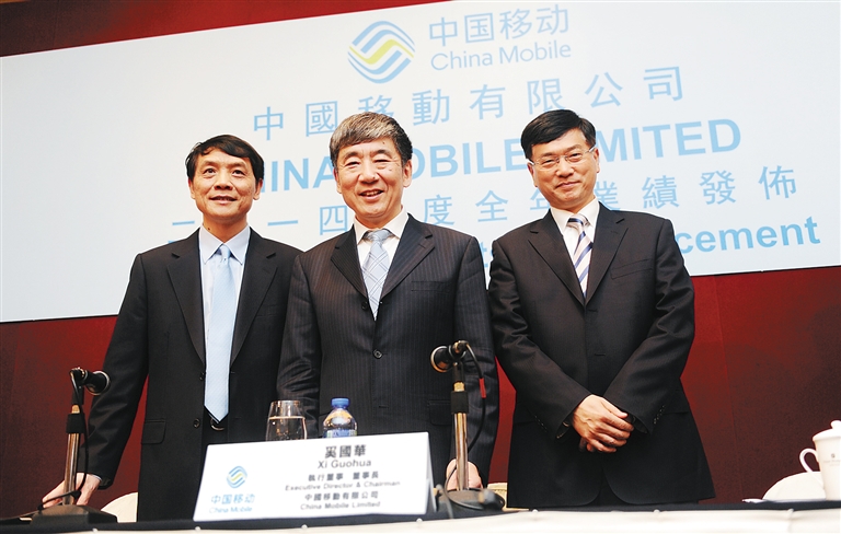 3月19日,中国移动董事长奚国华(中)等出席在香港举行的新闻发布会。 当日,中国移动有限公司公布2014年全年业绩,期内公司营运收入为6414亿元人民币,增长1.8%;股东应占利润为1093亿元,下降10.2%。 新华社记者 吕小炜 摄