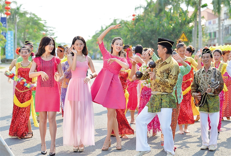 3月19日,万宁兴隆旅游区印尼风情的歌舞演员正在与“游客”互动表演,这是该市正在拍摄的旅游宣传片中的一个镜头。与以往单纯介绍景点不同的是,这次主要是以推介新开发的旅游产品为主,通过吃、住、游、行的体验式展现,吸引并留住更多的游客。本报记者 王凯 摄