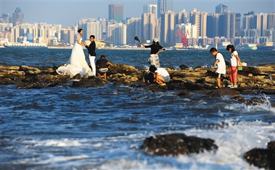 3月20日,美丽的夕阳下,新人们在海口市西海岸的礁石上拍摄浪漫婚纱照。据了解,海口的一些大型婚纱店通过网络推介和网上预约,吸引着来自各地的新人拍摄,生意火爆。本报记者 苏建强 摄