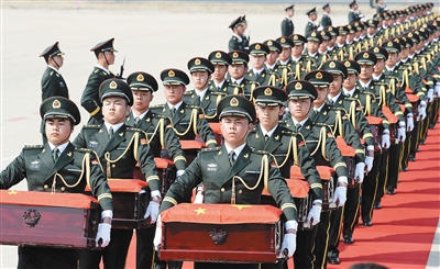 中国人民解放军仪仗队士兵从韩方士兵手中接回收殓志愿军烈士遗骸的棺木。中国驻韩国大使邱国洪为每具棺木盖上五星红旗,并轻轻将国旗铺好、展平。