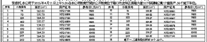 标的展示时间:4月8日、9日2天。特别说明:1、拍卖标的为毛坯房,按现状拍卖。2、房产临海口市滨海大道,毗临棕榈广场、海航国际广场,对面是双岛学校,地理位置十分优越,适合商住两用。3、房产过户税、费按国家规定由买卖双方各自承担。有意竞买者,请于2015年4月10日17:00前来我公司交纳竞买保证金并办理竞买手续,逾期不予办理。交纳保证金单位名称:海南融和拍卖有限公司;开户行:工行海口蓝天支行;账号:2201023809200968779。电话:0898-68522193 13976113935地址:海口市蓝天路国机中洋公馆1号楼B-705房 网址:www.ronghepm.com