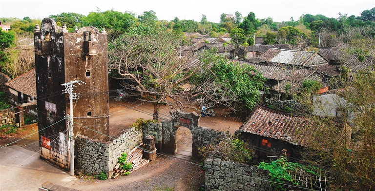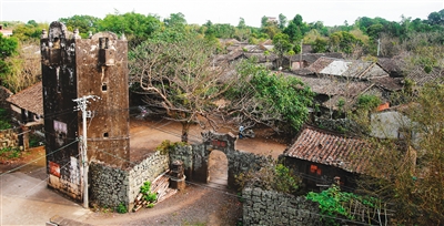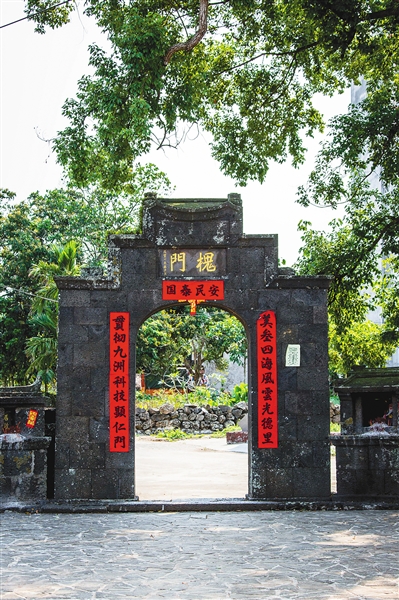 海口市石山镇美贯村的古村门,正面镶刻“槐门”,背面是“魁星楼”。