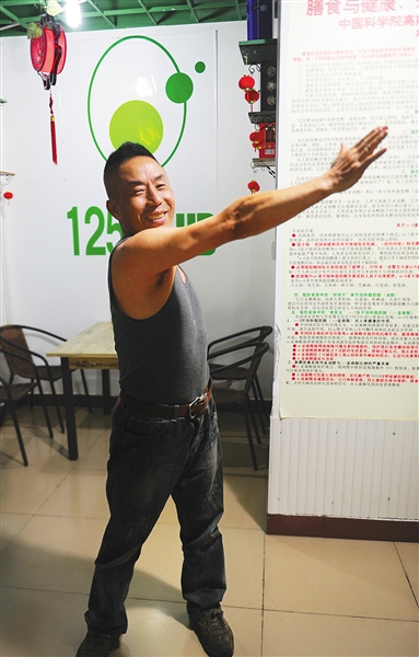 于是,精力还算旺盛、头脑比较灵活的他,开始翻看书籍,寻访医药养生专家,通过学习总结,他给自己定了几条“规矩”:第一,每天中午和晚上只吃菜,不再吃主食,并且吃菜也很有讲究,强调少吃盐,尽量少吃肥肉或不吃肥肉,适当吃瘦肉,例如吃白切鸡,他通常都要剥掉含脂肪量高的鸡皮,只吃鸡胸和鸡腿的瘦肉;第二,规律生活作息,每天早睡早起,中午饭后12点左右,坚持午睡1个小时,绝不熬夜通宵;第三,坚持运动,运动的方式有很多,但在他看来,最好的养生运动方式就是散步,不过不同于一般人闲逛式的散步,他坚持快走,走到身体发热微微出汗刚好。