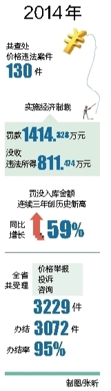 2014年共查处价格违法案件130件,实施经济制裁3760.359万元(罚款1414.328万元,没收违法所得811.474万元,退还用户1534.557万元,上缴财政2225.802万元),罚没入库金额连续三年创历史新高,同比增长59%。