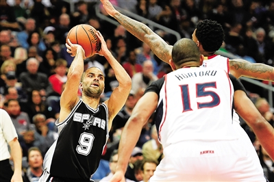3月23日,在NBA常规赛中,马刺队客场以114:95战胜排名东部第一的老鹰队。图为马刺队球员帕克(左)在比赛中进攻。新华社发
