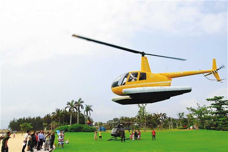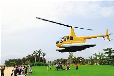 今天开通航线的起飞地点位于海棠湾凯宾斯基酒店,主要观光线路有海棠湾海岸线观光和蜈支洲岛观光,价格分别为900元/人、1200元/人。亚龙公司将长期在此停放美国罗宾逊R44和贝尔407两架直升机供游客体验。记者今天乘机时看到,海棠湾美丽的海岸风光、风情各异的酒店建筑、蜈支洲岛全景可一览无遗,感觉十分畅快。
