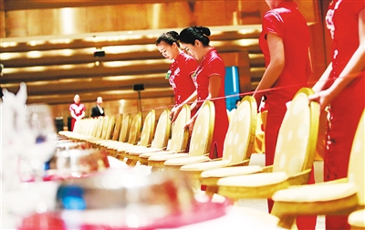 博鳌亚洲论坛2015年年会开幕在即,3月24日,在论坛年会主会场,服务人员正在对餐饮服务、会场礼仪等方面的细节做进一步的演练与完善。据了解,为服务好此次盛会,不仅海南中远博鳌公司所有员工纷纷上阵,还通过合作等方式从省内各大院校、企业招募了大量“外援”。