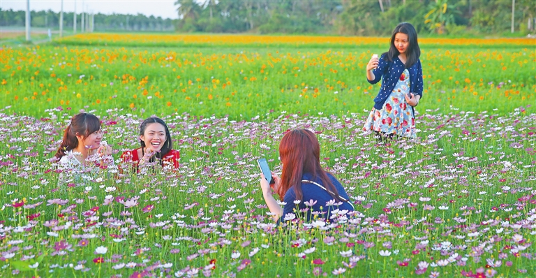 这是一个花香四溢的田园。在琼海的美丽田园和美丽乡村,草莓红了,瓜果熟了;桃花艳了,樱花红了,桂花香了,格桑花、虞美人花海中争奇斗艳……在龙寿洋花海,金灿灿的万寿菊,绚烂多姿的格桑花,还有那一树树早已绽放的热带樱花,在这里汇成一片花的海洋。西藏的格桑花、武汉的樱花,如今全都汇聚在这里,共同演绎美丽的大地艺术。