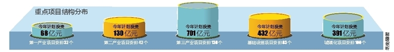 其中,第一产业项目安排32个,今年计划投资68亿元;第二产业项目安排42个,今年计划投资130亿元;第三产业项目安排136个,今年计划投资701亿元;基础设施项目安排83个,今年计划投资432亿元;城镇化项目安排100个,今年计划投资391亿元。