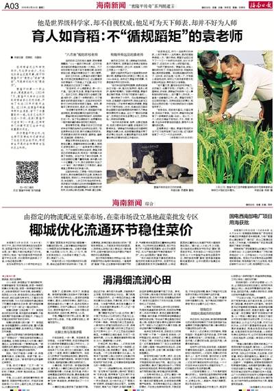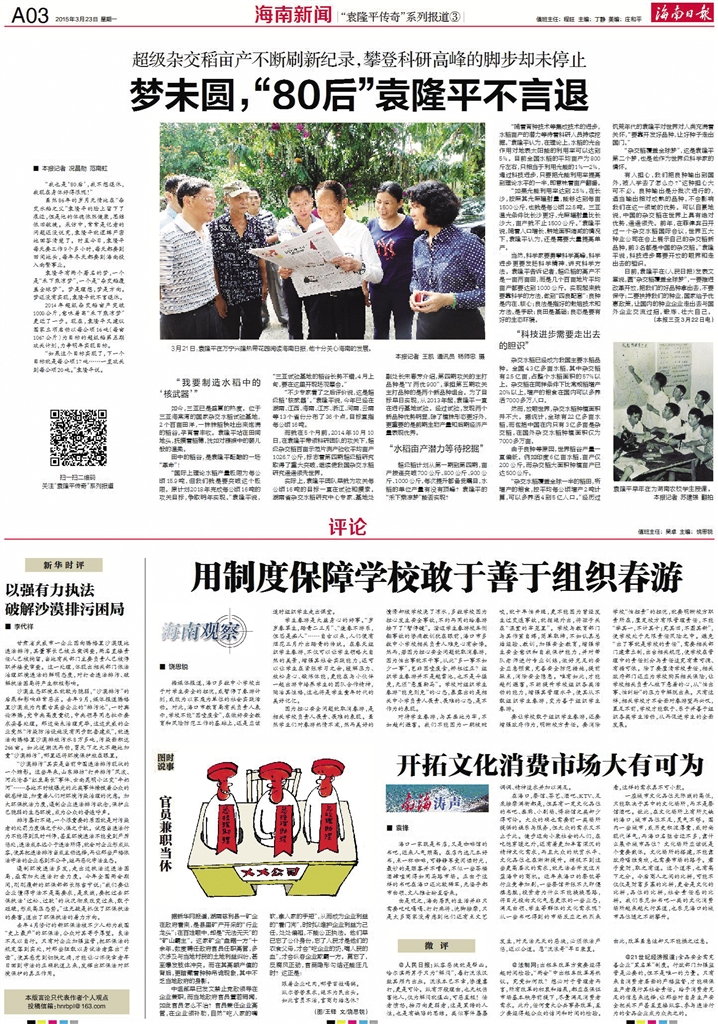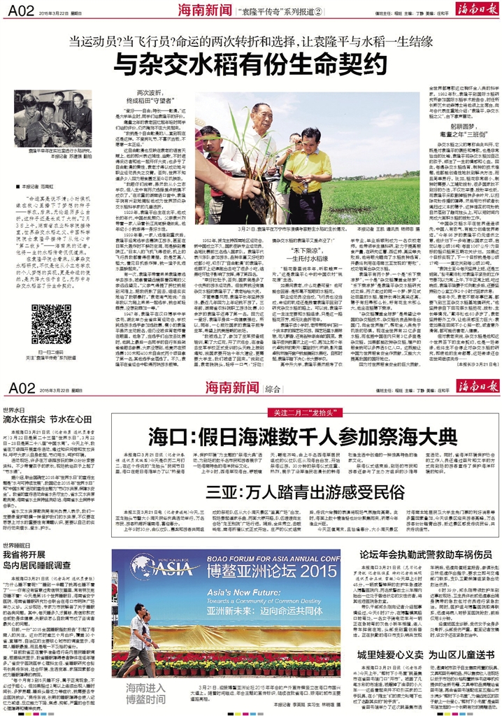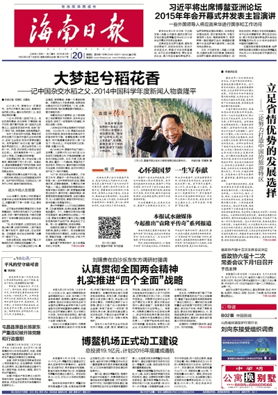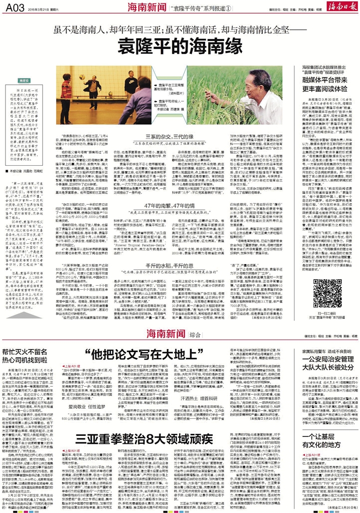 3月20日至24日,海南日报倾力打造“袁隆平传奇”系列报道,以《大梦起兮稻花香》、《袁隆平的海南缘》、《与杂交水稻有份生命契约》、《梦未圆,“80后”袁隆平不言退》、《育人如育稻:不“循规蹈矩”的袁老师》等多篇通讯报道,带着读者走近这位享誉世界的“杂交水稻之父”,关注他的中国梦,倾听他的海南情,引起众多读者关注热议。