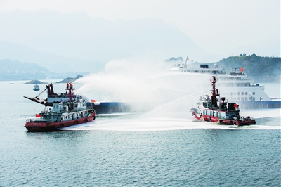 3月24日,长航公安宜昌分局干警在进行水上消防演习。当日,长航公安宜昌分局举行2015三峡坝区水上消防演习。演习内容假定三峡坝前水域一艘滚装船上的车辆失火,船上多人被困。接警后,该局启动应急预案,公安干警、水上消防人员驾驶巡逻艇、消防船舶赶赴现场,抢救“伤员”并对船舶进行灭火。 新华社发(郑家裕 摄)