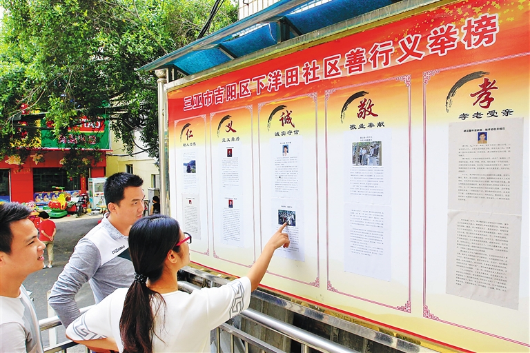 图为三亚市吉阳区下洋田社区居民正在观看“善行义举榜”。