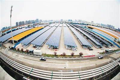 位于江苏南京江宁区上海大众汽车南京分公司厂内的光伏车棚(3月26日摄)。 当日,位于江苏南京江宁区上海大众汽车南京分公司厂内的光伏车棚作为全球装机容量最大的光伏建筑一体化电站,被颁发吉尼斯世界纪录证书。 新华社记者 李响 摄