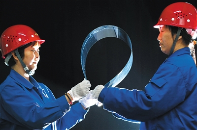3月26日,在河南洛阳中国洛玻集团龙海电子玻璃有限公司生产车间,工作人员展示超薄玻璃的良好韧性。 近日,中国洛玻集团龙海电子玻璃有限公司首批0.25毫米厚度浮法玻璃成功下线并开始批量生产,标志着中国洛玻集团成功打破自己保持的0.33毫米国内最薄玻璃纪录。这种玻璃不仅厚度仅约0.25毫米,而且韧性十足,可满足手机、平板电脑、导航仪等的显示屏对超薄玻璃的需求。 新华社发(张晓理 摄)