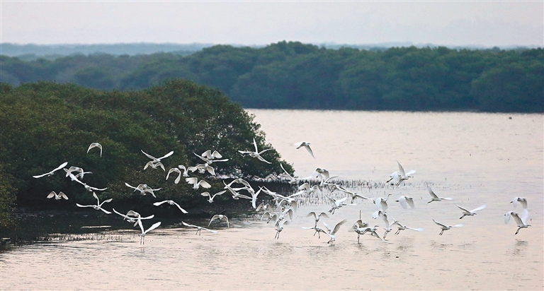 从这里驱车向东28公里的海口东寨港,实施了农场移交、红树林资源统一管控并对红树林保护立法等改革措施后的首个“观鸟节”,共观测到90种鸟类,新发现红喉姬鹟、红嘴蓝鹊、白喉红臀鹎3种鸟类,一次观测到的鸟类数量是过去的两倍多。