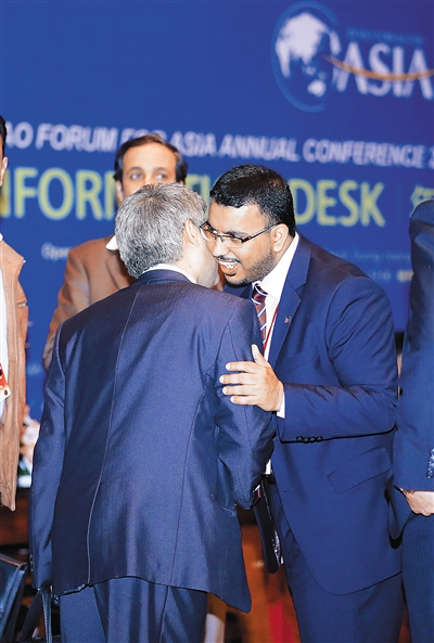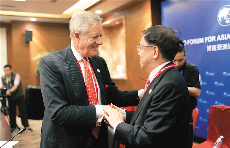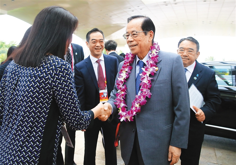 | 3月26日,博鳌亚洲论坛2015年年会即将开幕,抵达的嘉宾热情问候。本报记者 张杰 摄 |