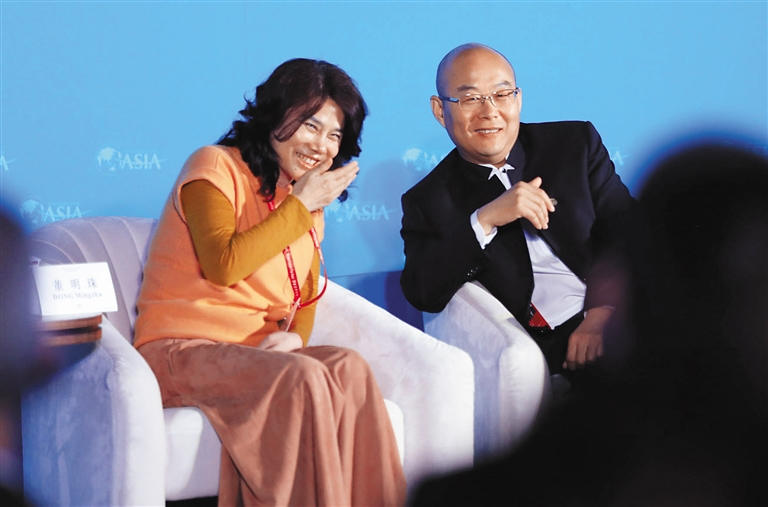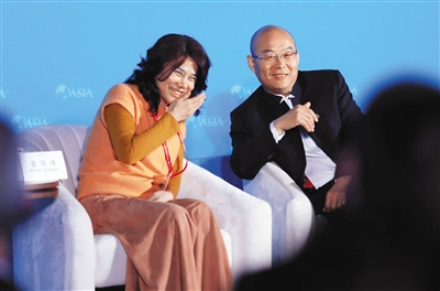 | 3月26日,在博鳌亚洲论坛2015年年会题为《政商关系新生态:君子之交相忘于江湖》分论坛现场,珠海格力集团有限公司董事长董明珠与《中国企业家》前社长刘东华在交谈。本报记者 张杰 摄 |