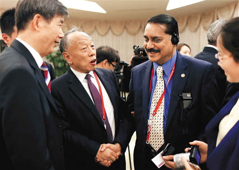 图为发布会结束后,李肇星与外籍嘉宾愉快交谈。