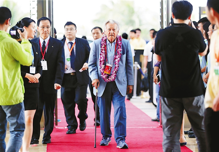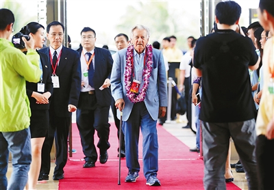 | 3月25日,澳大利亚前总理、博鳌亚洲论坛发起人之一的霍克先生抵达博鳌亚洲论坛大酒店,受到热烈欢迎。本报记者 张杰 摄 |