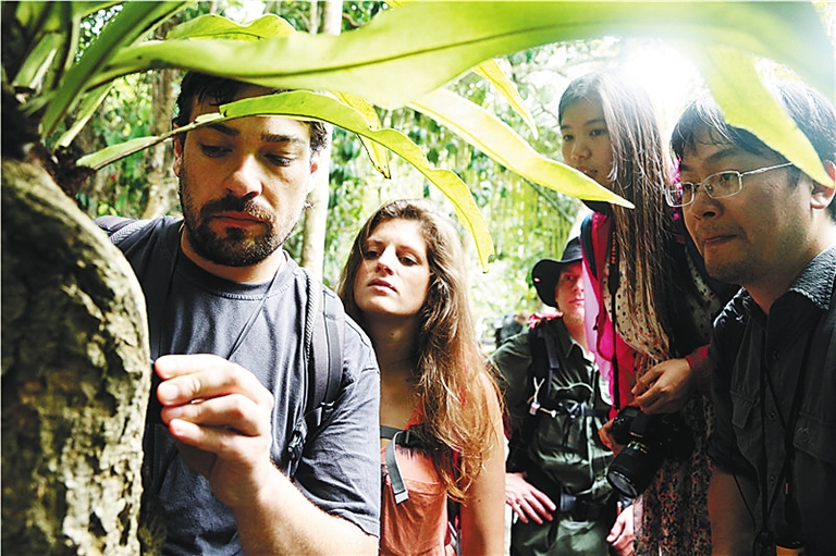 走进呀诺达雨林,在中国科学院华南植物园邢福武教授的介绍下,鲜有了解热带植物的德国拜罗伊特大学师生们,对热带雨林生物产生浓厚的兴趣,对他们没见过的植物绞杀、空中花园、老茎生花、藤本攀附、高板根、根包石等六大雨林奇观更是赞不绝口。