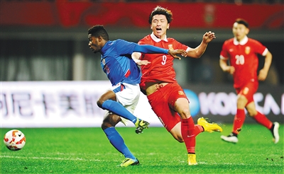 中国队门将王大雷在第35分钟禁区内控球失误,被海地队路易斯抢断破门。第58分钟,替补出场的杨旭接应吉翔传中将比分扳平。此后中国队明显占据场面优势,但海地队在第78分钟由格里尔再度入球。第82分钟,刚刚替补出场的于大宝在角球攻势中头球扳平比分。