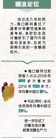 经过这几年的努力,海口顺利通过了国家环保模范城新标准考核,良好的生态环境吸引了国内外游客纷至沓来,也成为招商引资的一张靓丽名片,海口接待过夜游客人次从2008年600多万增长到2014年1130多万,年均增长超过10%,全社会投资年均增长超过20%,进一步印证了改善生态环境就是发展生产力。