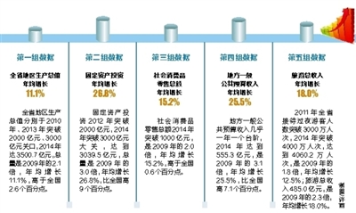 毛超峰通报了几组数据:第一组数据,全省地区生产总值分别于2010年、2013年突破2000亿元、3000亿元关口,2014年达3500.7亿元,总量是2009年的2.1倍,年均增长11.1%,高于全国2.6个百分点。第二组数据,固定资产投资2012年突破2000亿元,2014年突破3000亿元大关,达到3039.5亿元,总量是2009年的3.0倍,年均增长26.8%,比全国高9个百分点。第三组数据,社会消费品零售总额2014年突破1000亿元,是2009年的2.0倍,年均增长15.2%,高于全国0.6个百分点。第四组数据,地方一般公共预算收入几乎一年一个台阶,2014年达到555.3亿元,是2009年的3.1倍,年均增长25.5%,比全国高7.1个百分点。第五组数据,2011年全省接待过夜游客人数突破3000万人次,2014年突破4000万人次,达到4060.2万人次,是2009年的1.8倍,年均增长12.5%;旅游总收入485.0亿元,是2009年的2.3倍,年均增长18.0%。
