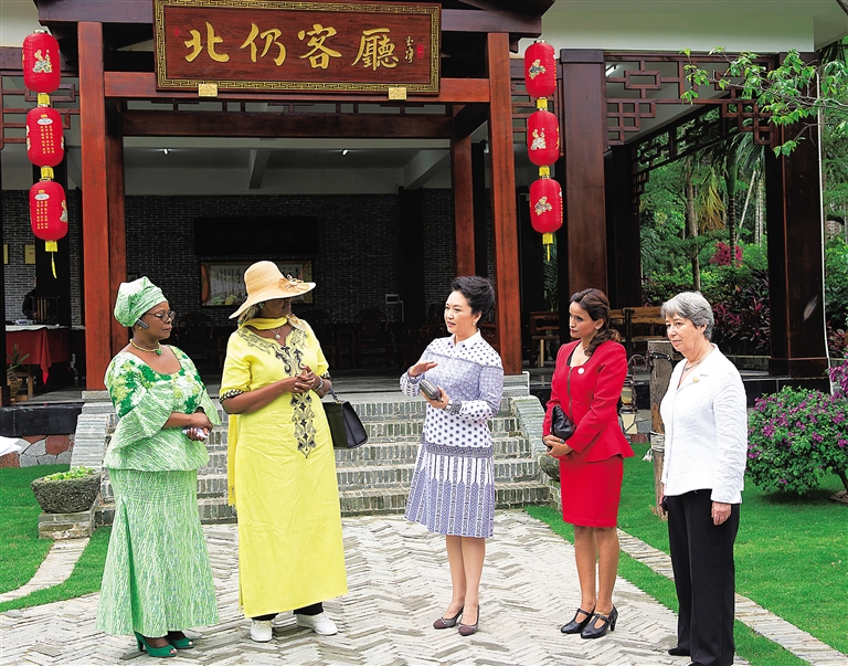 椰林茂密,鲜花嫣红。下午4时许,奥地利总统夫人玛吉特、乌干达总统夫人珍妮特、赞比亚总统夫人埃斯特、尼泊尔总统女儿阿妮塔抵达琼海市嘉积镇北仍村时,受到彭丽媛热情欢迎。