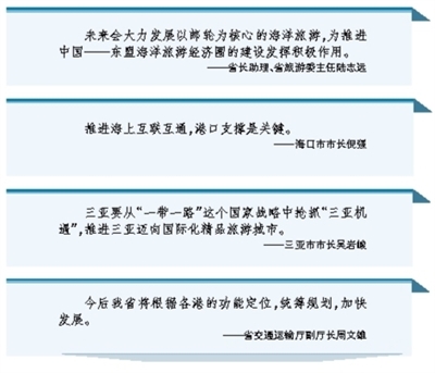 “今天下午国家刚刚在博鳌发布的‘一带一路’愿景与行动中,明确提出海南是‘一带一路’特别是21世纪海上丝绸之路建设的排头兵和主力军,要加大海南国际旅游岛开发开放力度,而且特别指出要加强旅游合作,推动21世纪海上丝绸之路邮轮旅游合作,这让我们倍感振奋!”省长助理、省旅游委主任陆志远说,面对新的发展机遇,海南确定了将建设世界一流的旅游特区作为海南实施“一带一路”战略的重要突破口,并同时将海南打造成为世界一流的精品旅游目的地,打造国际旅游岛的升级版。