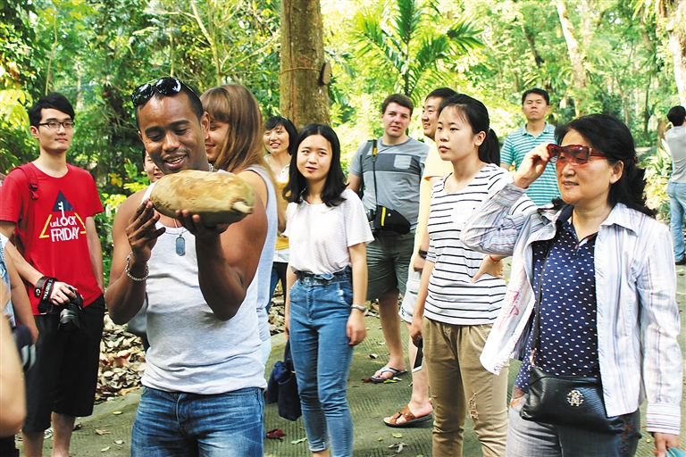 海南大学国际文化交流学院副院长贾绍东介绍,这次组织的留学生,来自欧美、亚洲、非洲的10多个国家,学历层次包括本科生和研究生。他表示,利用周六、周日让留学生们走出课堂、走向社会、走向自然,融观光、教学于一体,是一次很有意义的体验式活动。