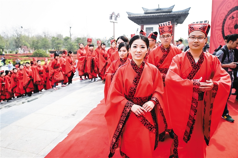 3月29日,一场别具特色的汉式集体婚礼在安徽省合肥市三国遗址公园内举行。30对新人身着华美汉服,演绎汉式婚礼礼仪,展现传统文化魅力。