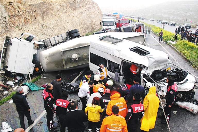 3月29日,土耳其桑利乌尔法省,由于下雨路滑和能见度低,一辆面包车在桑利乌尔法-阿克查卡拉公路上与一辆混凝土搅拌机相撞,紧随其后的一辆小汽车也撞上,造成至少12人死亡、6人受伤。死亡人数中有一些是叙利亚籍公民。这是车祸现场(3月29日摄)。 新华社发