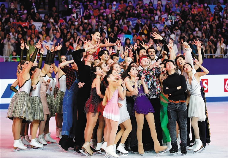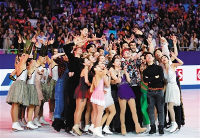 3月29日,2015年花滑世锦赛在上海东方体育中心“海上王冠”体育馆落幕。图为选手们在表演结束后用自拍杆和观众一起自拍。 新华社发