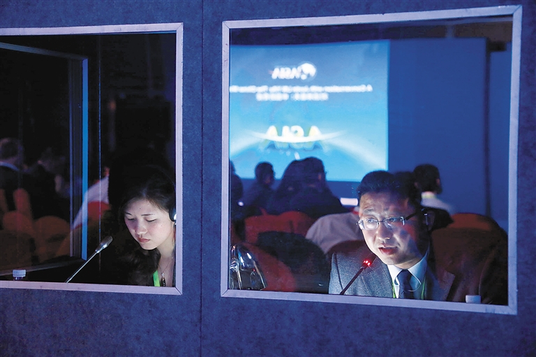 图为会场一角,在翻译间里认真听嘉宾发言,进行同步翻译的工作人员。