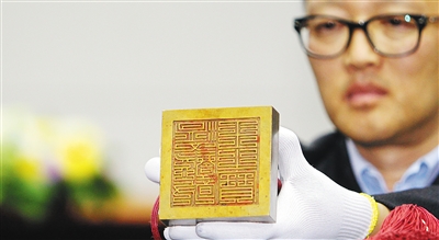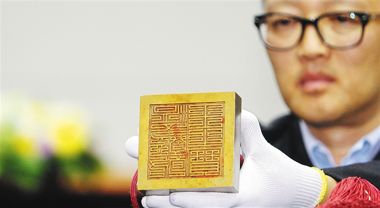 4月1日,在韩国首尔国立古宫博物馆,工作人员向记者展示朝鲜王朝德宗印章“德宗御宝”。 当日,美国西雅图艺术博物馆向韩国正式返还了朝鲜王朝德宗印章“德宗御宝”。2014年,韩国文化财厅派代表前往西雅图艺术博物馆调查馆藏韩国艺术品的情况,韩方提出了希望该馆返还德宗印章的请求。双方从去年7月至11月一直在商讨具体的文物返还事宜,并于12月共同宣布了向韩国返还德宗印章的决定。新华社记者 姚琪琳 摄
