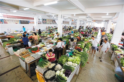 4月1日,海口市美兰区美苑路的瓦灶民生市场经营秩序良好。据了解,该处原是一处脏乱差的马路市场,有关部门对其进行集中整治、规划建设。现在农贸市场内摊位整齐划一,地面环境卫生状况良好。