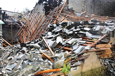 江西省万年县汪家乡昌港村的一间民房被大风吹毁(4月3日摄)。 4月2日下午至3日上午,江西省上饶市万年县7个乡镇遭受大风和冰雹袭击,3000多户农户房屋不同程度受损。灾情发生后,该县组织党员干部深入田间,帮助种植户救灾,最大程度降低损失。 新华社发(陈风华 摄)