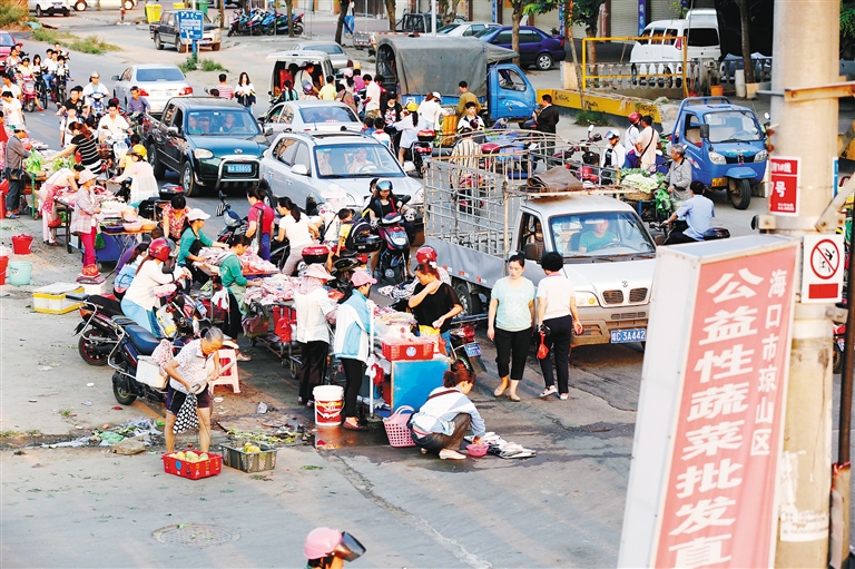 一年多之前,海口府城镇振发横路还是一条十分安静,车辆稀少,人流量较少的偏僻小路。然而这种场景却随着海口市琼山区蔬菜批发市场的进驻,发生了天翻地覆的变化。而今的振发横路随处可见在路沿贩卖蔬菜、水果、小吃等小摊位,来来往往的大卡车以及熙熙攘攘的人群。其中夹杂着尖锐的汽笛声、忽大忽小的贩卖声等,好不热闹!