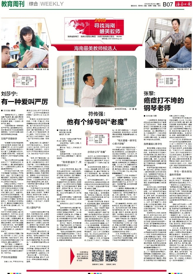 各位读者,教育周刊每周二都会推出海南最美教师候选人事迹报道,如果他们的故事曾经打动您,希望您给教育周刊留言。