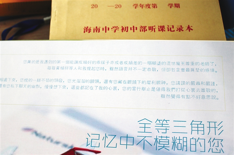 “我记得当年中考备考体育的时候,陈老师陪着我们在操场上一圈圈跑步的情景,他年纪大了,身体也不好,但硬是坚持着陪我们跑,给我们很大的鼓励。”海南中学高一(1)班的邢晓彦原来也是陈健科初三(8)班的学生,中考取得了771分的高分,被海南中学理科实验班录取,“陈老师出题很刁钻,后来模拟考一听是他出题,大家都可紧张了,但又都铆着一股劲,想要考好一些给陈老师看看。”