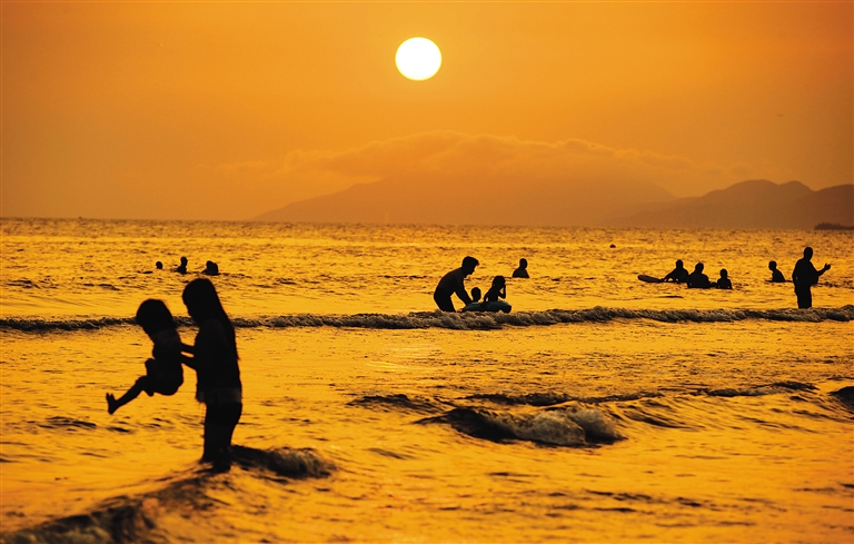 4月5日,人们在三亚海边夕阳中游玩、消暑。