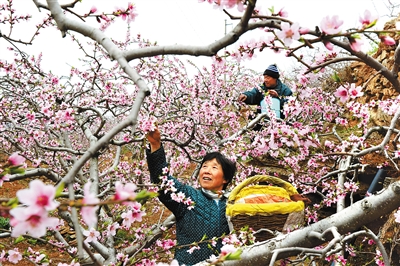4月6日,山东省沂源县西里镇涌泉村的农民在疏摘桃花。 近年来,山东省沂源县西里镇加快开发桃花产业,通过建立桃花研究所、成立桃花加工协会等措施,把昔日桃园里的疏花落花做成增收致富的大产业。当地农民将在全县范围收购的桃花进行晾晒、烘烤,加工成洗浴、茶饮等用途的桃花制品,远销国内外,年加工鲜桃花达100多万公斤,年销售额达3000万元。