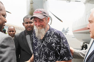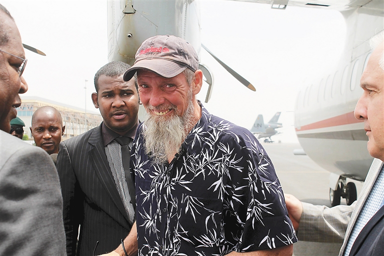 4月7日,被法国特种部队解救的荷兰人质沙克·赖克(右)抵达马里首都巴马科的机场。 法国国防部6日宣布,法军特种部队当天在马里北部的一次行动中解救了这名叫沙克·赖克的人质。该人质于2011年11月25日在马里的通布图被“基地”组织北非分支的武装人员绑架。法军在这次行动中还逮捕了多人。 新华社/路透