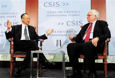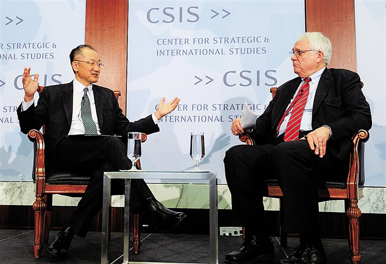 4月7日,在美国首都华盛顿,世界银行行长金镛(左)在战略与国际问题研究中心发表演讲。 世界银行行长金墉7日表示,世行欢迎亚洲基础设施投资银行(亚投行)的成立,并准备与之分享发展经验。 新华社记者 鲍丹丹 摄