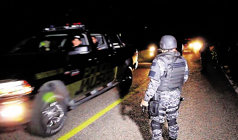 4月6日,警察在墨西哥哈利斯科州公路上执勤(视频截图)。 墨西哥哈利斯科州官方7日说,该州警察6日下午在靠近圣塞瓦斯蒂安市的一条公路上执勤时,遭遇埋伏在附近的一伙不明身份的枪手袭击,15名警察死亡,5名警察受伤。 新华社/法新