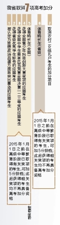 这是我省连续第二年削减高考加分项目,2014年曾取消四项高考加分项目,收紧3个加分项目的条件。