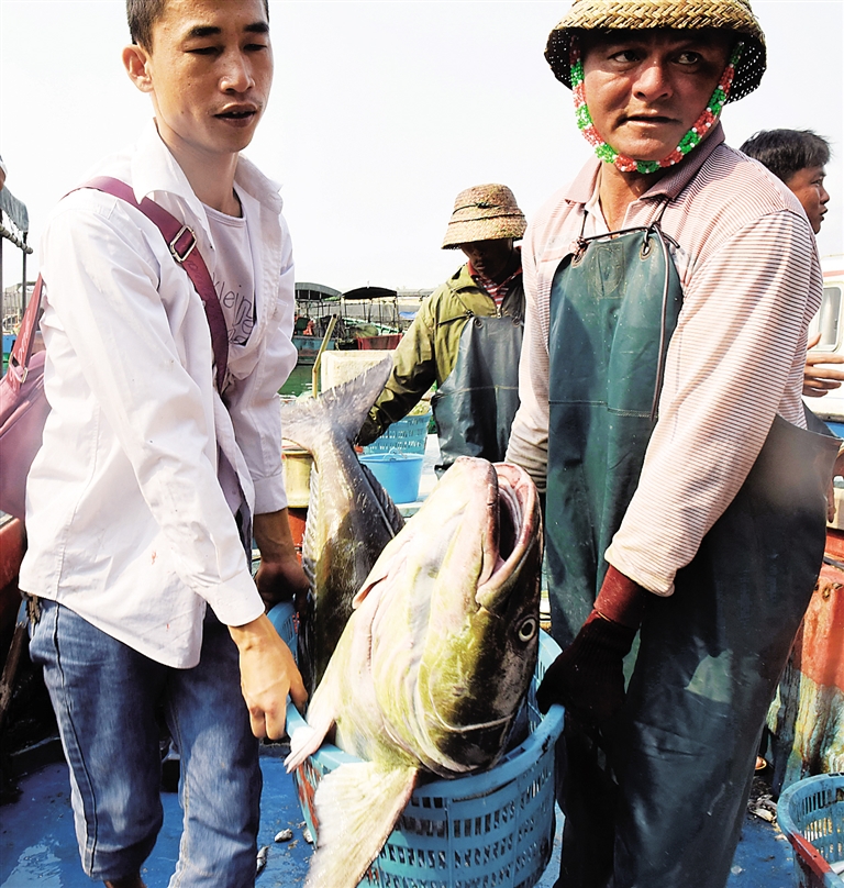 4月6日,在琼海市博鳌镇,渔民们搬运大鱼回港。