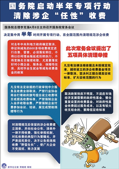 国务院常务会议决定,集中半年时间全面清理涉企收费,通过简政放权、放管结合、转变政府职能,立规矩、建机制,用依法、规范、透明的管理制度扼制“任性”收费。